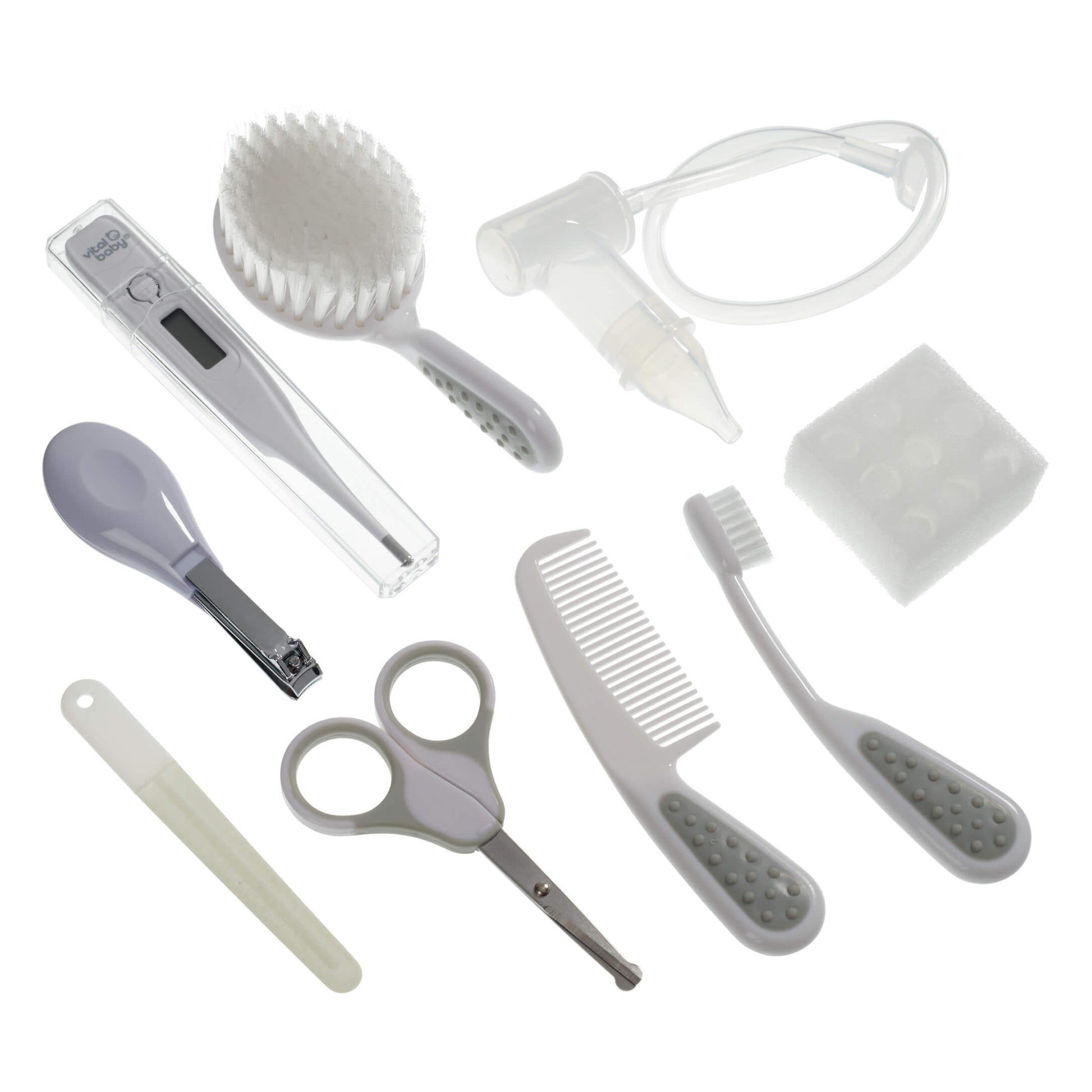 Included in the pack: 1x biodegradable brush, 1x biodegradable comb, 1x biodegradable toothbrush, 1x body thermometer, 1x nail scissors, 1x nail clippers, 1x emery board, 1x breathe easy, 10x breathe easy spare filters