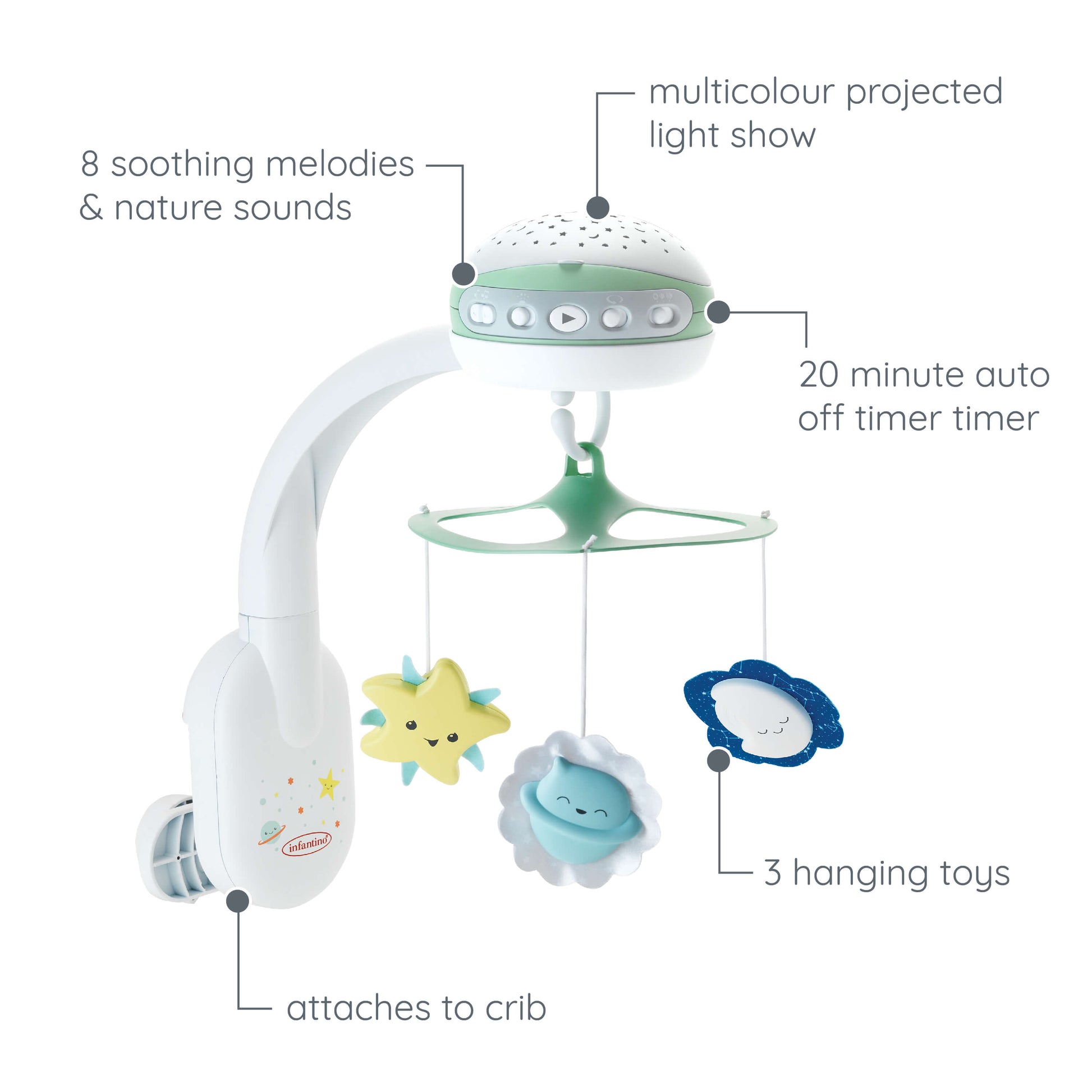 - 3-in-1: Crib mobile, crib projector, tabletop projector
